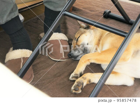 テーブルの下で寝る犬
