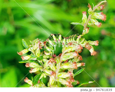 ヨモギに擬態するハイイロセダカモクメの幼虫