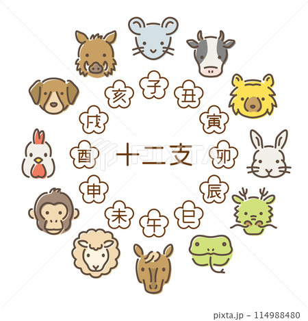 干支の赤い丸型スタンプ かわいい十二支の顔アイコン2種と漢字アイコンセット