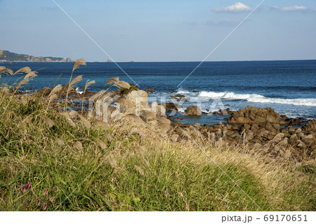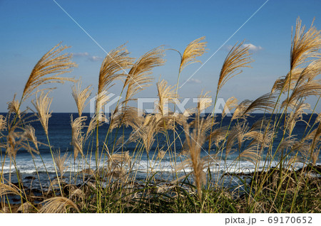 種子島のススキが風に揺れる秋の美しい竹屋野海岸