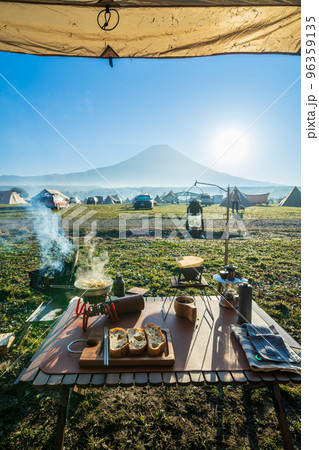 「静岡県」キャンプ場で富士山を眺めながらの朝食