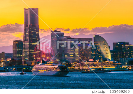 日本の横浜都市景観珍景富士山(中央奥)と飛鳥Ⅲが競演(新港ふ頭にはにっぽん丸)。左に関内タワー…