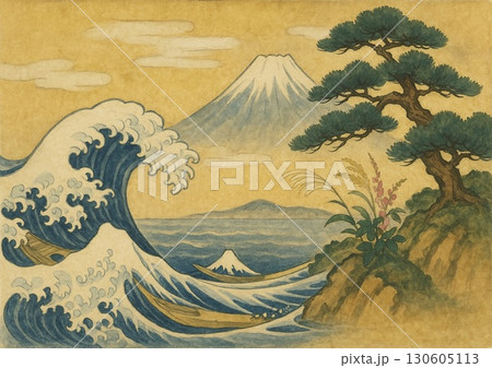 2025年賀状テンプレート「浮世絵風デザイ」あけおめ 添え書き付