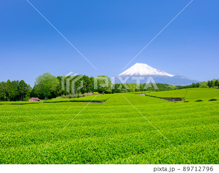 日本の風景 新茶の茶畑と富士山 静岡県富士市笹場