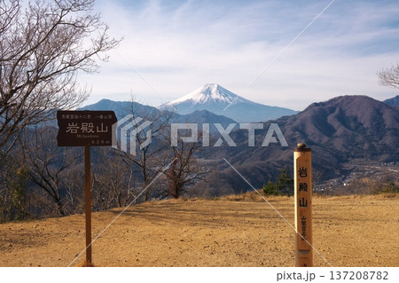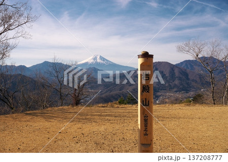 山梨県岩殿山山頂の絶景 富士山を望む秀麗富嶽十二景の看板と山梨百名山の標柱 標高634メートル