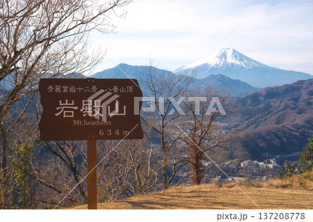 山梨県大月市・岩殿山山頂からの富士山遠望 標高634mの山頂看板と秀麗富嶽十二景の絶景