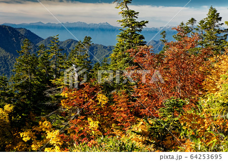 千枚小屋への登山道の見晴台から見る赤石岳 南アルプス 悪沢岳と荒川岳登山