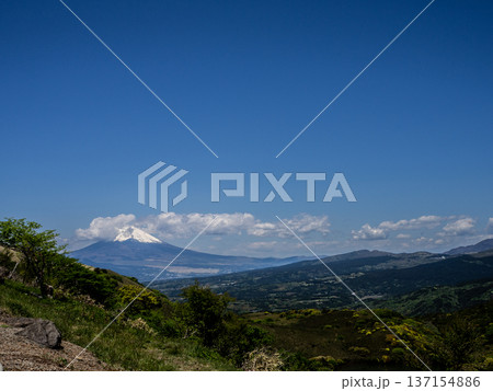 (静岡県)伊豆パノラマパーク・碧テラスの向こうに、雪化粧した富士山