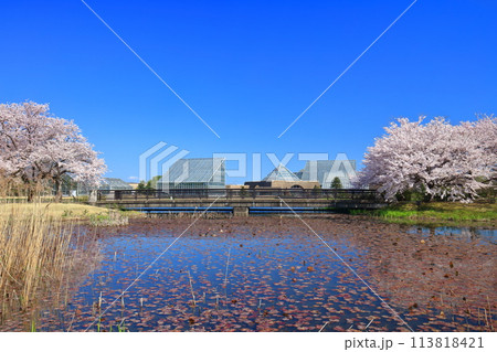 【富山県】快晴の富山県中央植物園の満開の桜(南池)