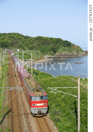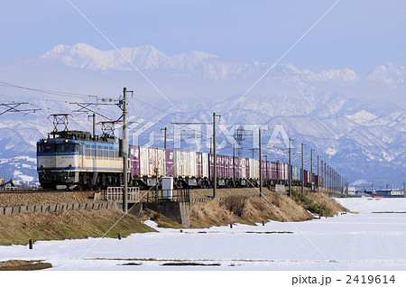 あいの風とやま鉄道の立山連峰バックを走るEF510の貨物列車