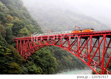 黒部峡谷鉄道 新緑の黒部峡谷 トロッコ電車で赤い鉄橋を渡るところ