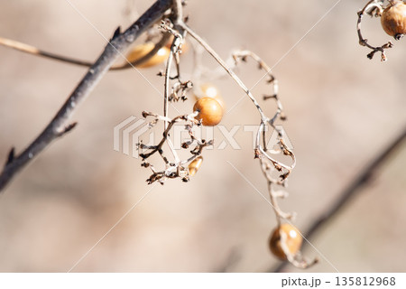 冬の冷たい空気を感じさせる葉の落ちた細い枝と茶色い小さな実