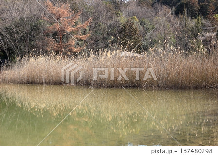 極寒の奈良布目ダム鉛色の空から陽春まで 枯草越しに見える布目ダム
