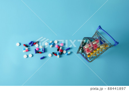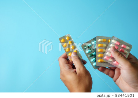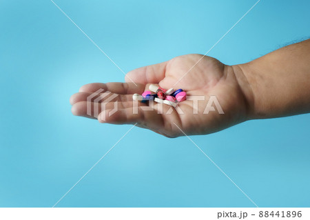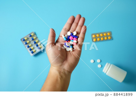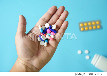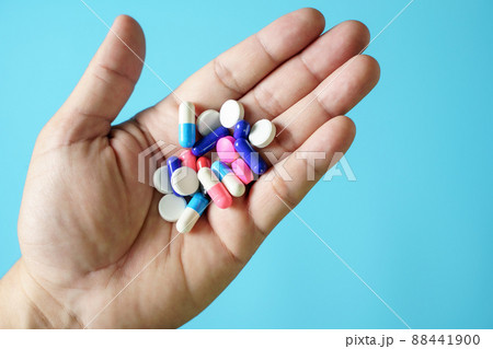 Healthcare treatment supplements. Handful of white round pills in female patients palm woman arm holding heap of small round meds and glass of water before taking medication