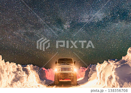 満天の星と天の川、雪道に佇むオフロード車の夜景
