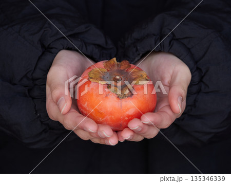 冬の屋外で子供の両手で持つ完熟の柿の様子