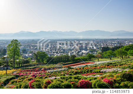 ツツジ咲く長岡山から望む寒河江の街並み
