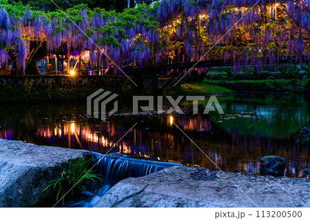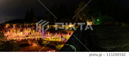 春夜のライトアップに映える藤棚風景(ヤマフジ天然記念物)「西寒多神社(ささむたじんじゃ)」大分市寒田