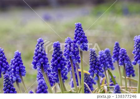 春の公園の花壇に咲く紫色のムスカリ。