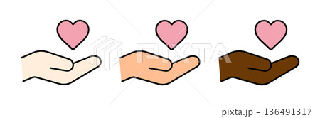 国際支援・平等を表すアイコン ピンクのハートマークと手 線画