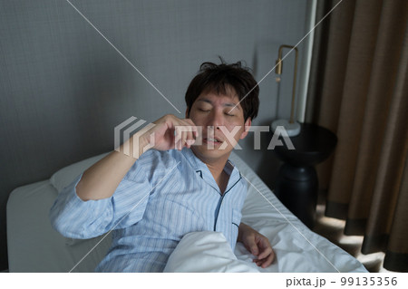 あくびをする日本人男性 不眠症 起床 起きる パジャマ