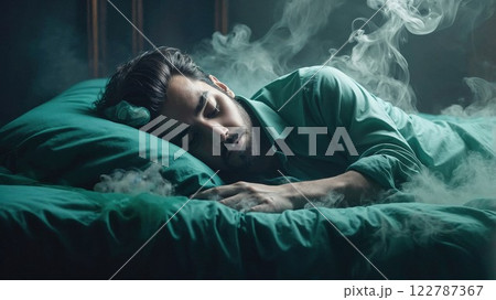 man peacefully asleep on a green pillow in an artistic, dreamy atmosphere surrounded by soft, swirling smoke, creating an ethereal mood