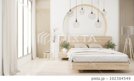 Bedroom japanese minimal style.,Modern white wall and wooden floor, room minimalist. 3D rendering