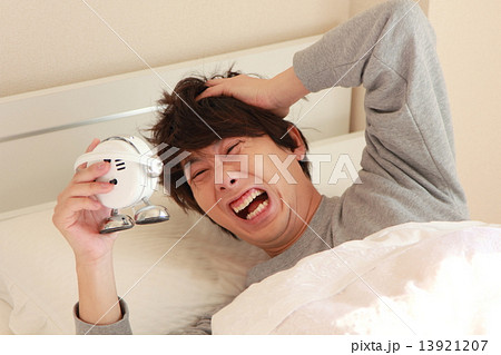 寝坊 遅刻 (男性 会社員 朝 朝寝坊 目覚まし時計 アラーム 寝室 ベッド 布団)