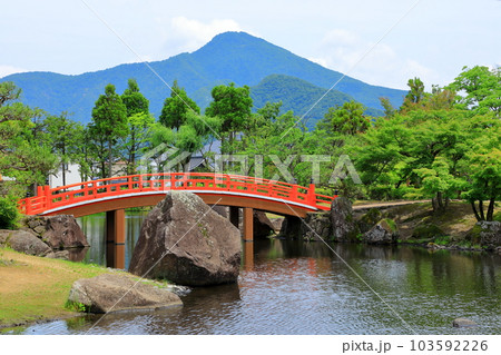 紫式部公園 泉池 朱色の反橋と中島 越前市