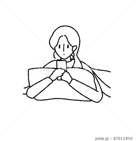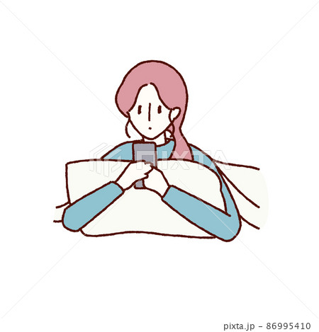 ベッドで寝転んでスマートフォンを使っている女性のイラスト