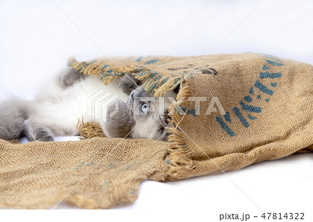 麻袋に隠れて遊ぶ子猫。戯れる,猫,ペットイメージ