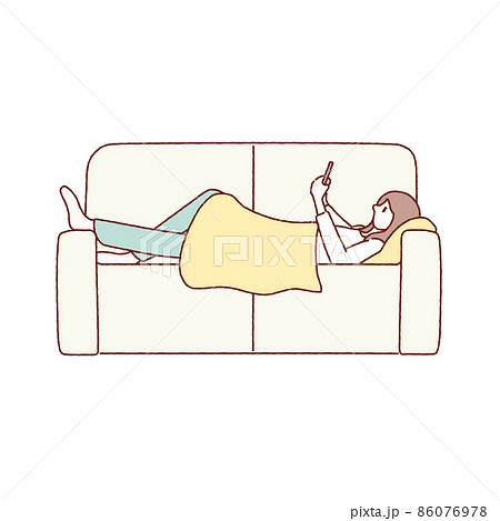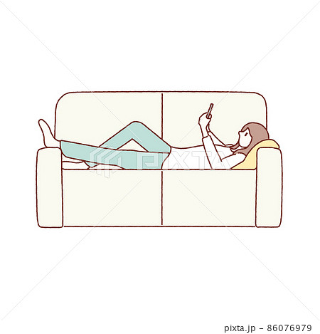 ソファーに寝転んでスマホを使っている若い女性の手描き風イラスト