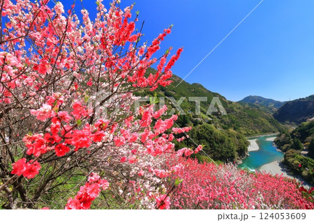 【高知県】快晴の花の里公園の満開の桜と花桃と仁淀川