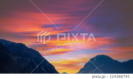 Beautiful mountains against sunset sky. Silhouette of mountains peaks during sunset