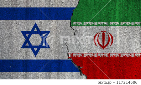 Israel vs Iran flag on cracked wall. Conflict between Iran and Israel concept. Political tension between Iran and Israel