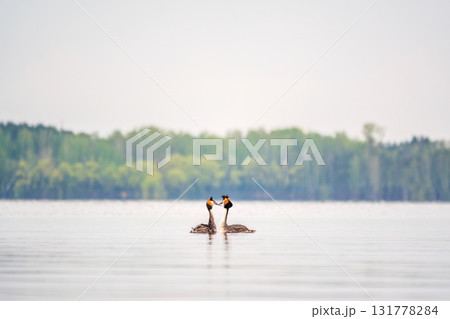 Mating games of two water birds Great Crested Grebes. Two waterfowl birds Great Crested Grebes swim in the lake with heart shaped silhouette