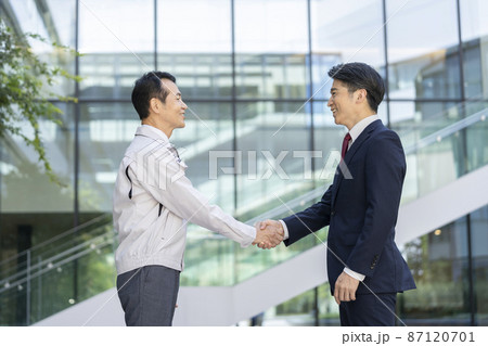 握手 作業服とスーツの男性 撮影協力「LINK FOREST」