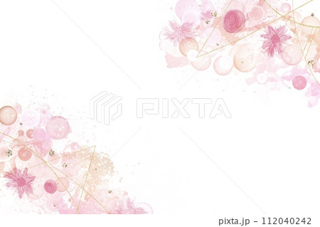 春夏用アルコールインクアートテンプレート。白背景にピンクの花とシャボン玉と金色幾何学模様