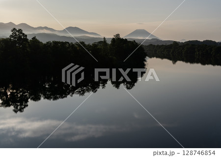 北海道寿都町に流れる朱太川河口付近の夏の風景を撮影