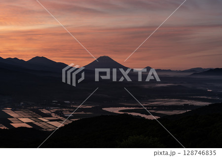 寿都町の磯谷牧場跡地から眺める日の出前の蘭越町と羊蹄山