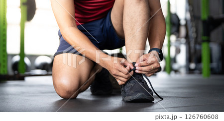 Wellness and Fitness. Individual tying shoelaces before gym workout.