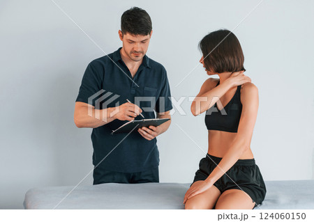 Sitting on the table. Woman visiting physiologist that making massages and helping with traumas