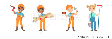 Little Kid Builder Character Wearing Hard Hat with Construction Tool Executing Work Vector Set