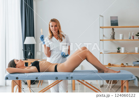 Clean skin. Woman is having sugaring procedure in the clinic by female doctor