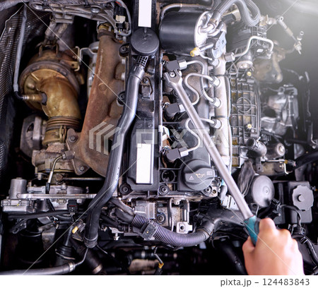 Car engine in garage, mechanic hands working on auto repair service and inspection of valve with wrench tools. Technician checking machine, f1 industry engineer and diesel motor vehicle performance