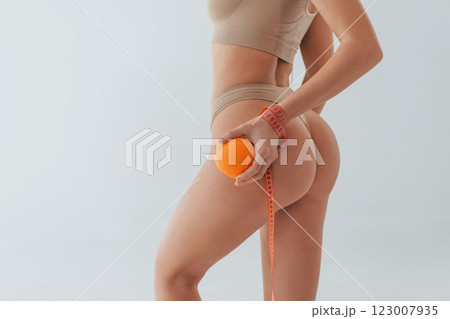 With orange and measuring tape. Woman in underwear with slim body type is posing in the studio