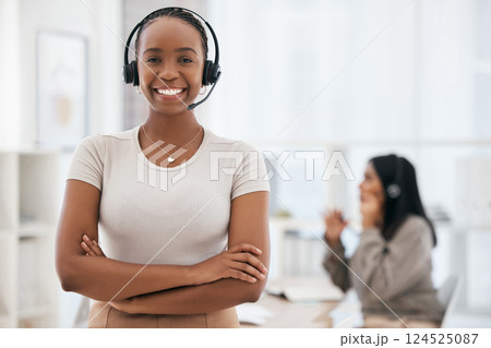 Happy and smiling woman wearing a headset working in a call centre portrait. Young, beautiful and confident professional female customer service agent talking and answering calls during a work day.
