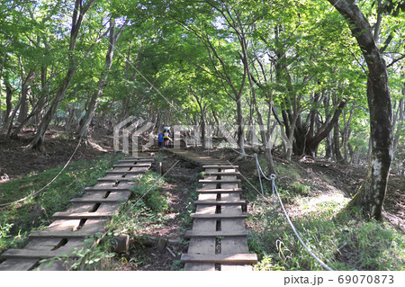 新緑の丹沢山稜線を行く登山者