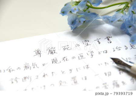 尊厳死の宣言書と書かれた文字にフォーカスして、万年筆と花も含む
