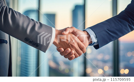 Professional businesspeople shaking hands, confirming partnership agreement in contemporary corporate sunny office. Business handshake